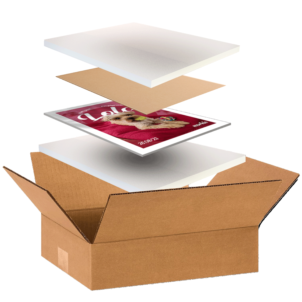 Kako bi osigurali tvoj poster u dostavi, koristimo nekoliko slojeva zaštite. Prvo tvoj uokvireni poster umotamo u nježnu i mekanu foliju, zatim dodajemo dvije ploče stiropora sa svake strane okvira te na kraju dodamo karton na staklo i pakiramo u custom napravljenu kutiju.